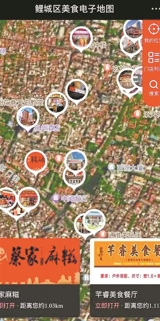 在功能模块设置方面,美食地图增设了“分类”板块,按照“最家常”“最风情”“最时尚”三个主题,对入驻的餐饮店进行分类。其中,“最家常”即本土闽南特色家常菜,“最风情”为具有异域风情元素的特色美食,“最时尚”就是当下流行、时兴的特色美食。鲤城区商务局工作人员告诉记者,目前他们仍在不断完善美食地图的各项功能,并将继续引导商家入驻,让市民游客“一图在手”就能“吃遍古城”。