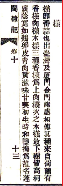 林建强翻阅明万历《泉州府志》、清乾隆《泉州府志》与《晋江县志》、清道光《晋江县志》等地方志,均未发现芒果的记载,可见近代之前,泉州或许仅有零星引种芒果,并未将其列为正式物产。而他发现,同期的台湾志书已对芒果有详细记载,清道光至咸丰年间,施鸿保所著《闽杂记·卷十》提到“檨,即番蒜也;出台湾及厦门、金门诸处”,结合泉州人也称芒果为“羡”的事实,可推断芒果或大规模从台湾引入泉州栽种,且大概率是在鸦片战争后的道光后期至咸丰年间。