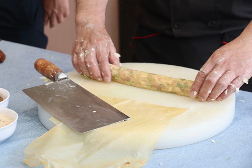 演示结束后,由学员自己上手制作鸡卷。有的学员初次尝试包鸡卷,馅料总是从豆皮中“跑出来”。师傅见状,立刻走到学员身边,耐心地演示如何在指缝间将豆皮与肉馅压紧压实。还有学员对翻卷封边的技巧不太熟悉,师傅便指出最后一步的小窍门:用蛋液涂抹豆皮边缘,并将开口朝下,同时提醒大家注意其他细节,以确保鸡卷的完整和美观。