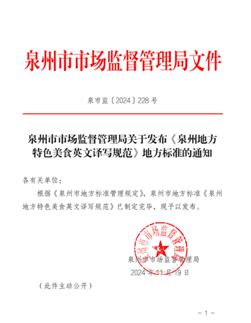 11月19日,由泉州市商务局、泉州市市场监督管理局等多部门,联合黎明职业大学、泉州市标准化研究所等单位共同制定的《泉州地方特色美食英文译写规范》地方标准顺利通过审查并正式发布。该标准的发布是传统风味与国际语言交融的探索,标志着泉州美食英文名称译写规范有章可循,以食为媒推动文化跨越国界,为泉州申创“世界美食之都”添砖加瓦,更加速了泉州美食的国际化进程。