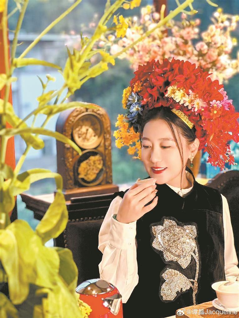 谭晶簪花品尝铁观音(微博@谭晶jacqueline)