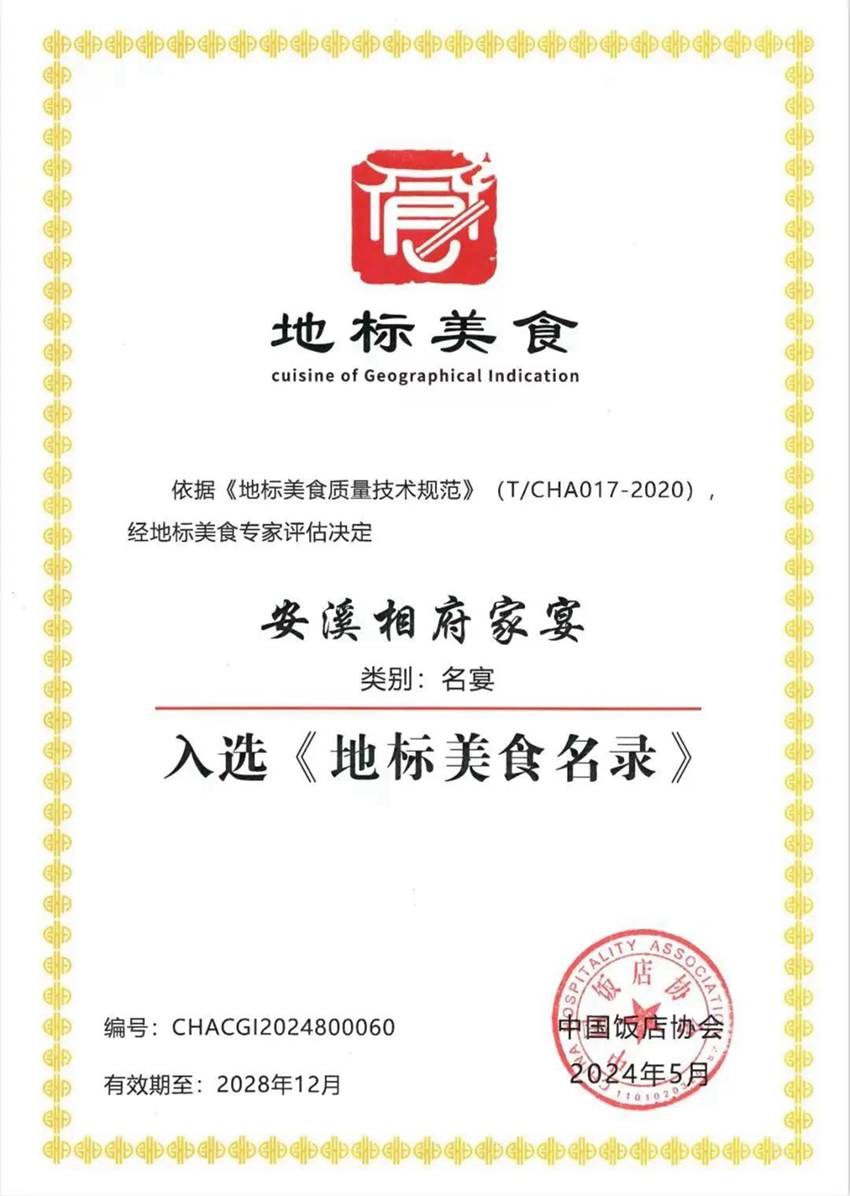 中国饭店协会依据《地标美食质量技术规范》标准(T/CHA017-2020),组织开展了地标美食/食材、地标美食代表性企业、地标美食代表性传承人申报评定,公布入选的地标美食相关名单。“安溪相府家宴”入选《地标美食名录》名宴。