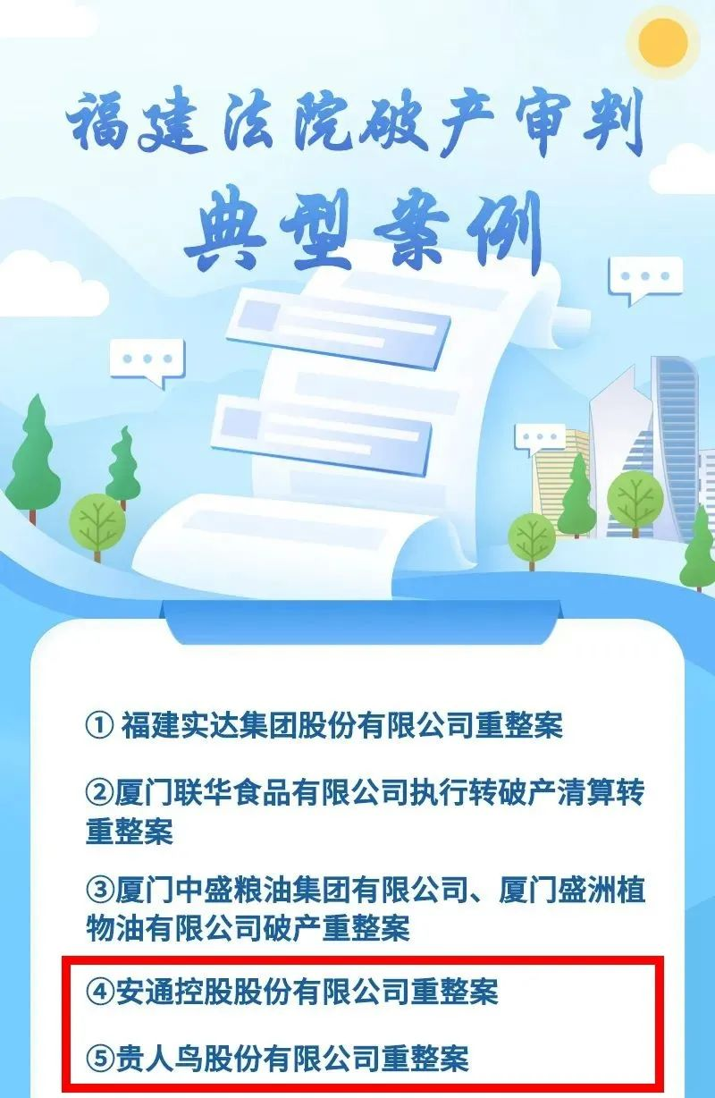 日前,福建高院发布11起“福建法院破产审判典型案例”,泉州中院审结的“安通控股股份有限公司重整案”“贵人鸟股份有限公司重整案”入选!
