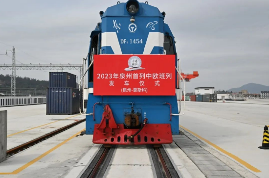 2月3日,伴随一声嘹亮的汽笛声,满载着55个集装箱、货值1750万元的日用百货由和谐号电力机车牵引的中欧班列自兴泉铁路黄塘站顺利出发,经内蒙古满洲里出境后,直奔1.1万公里外的莫斯科,这是2022年12月30日兴泉铁路开通后黄塘站作为泉州中欧班列始发站的首发之旅,开启新一年泉州中欧班列“加速度”发展新征程。新路线比原经漳泉肖铁路少213公里,加上兴泉铁路时速提高到160公里,预计开行16天,比原路线节省2天时间,将有力促进“海丝”与“陆丝”无缝对接,促进泉州外贸高质量发展。