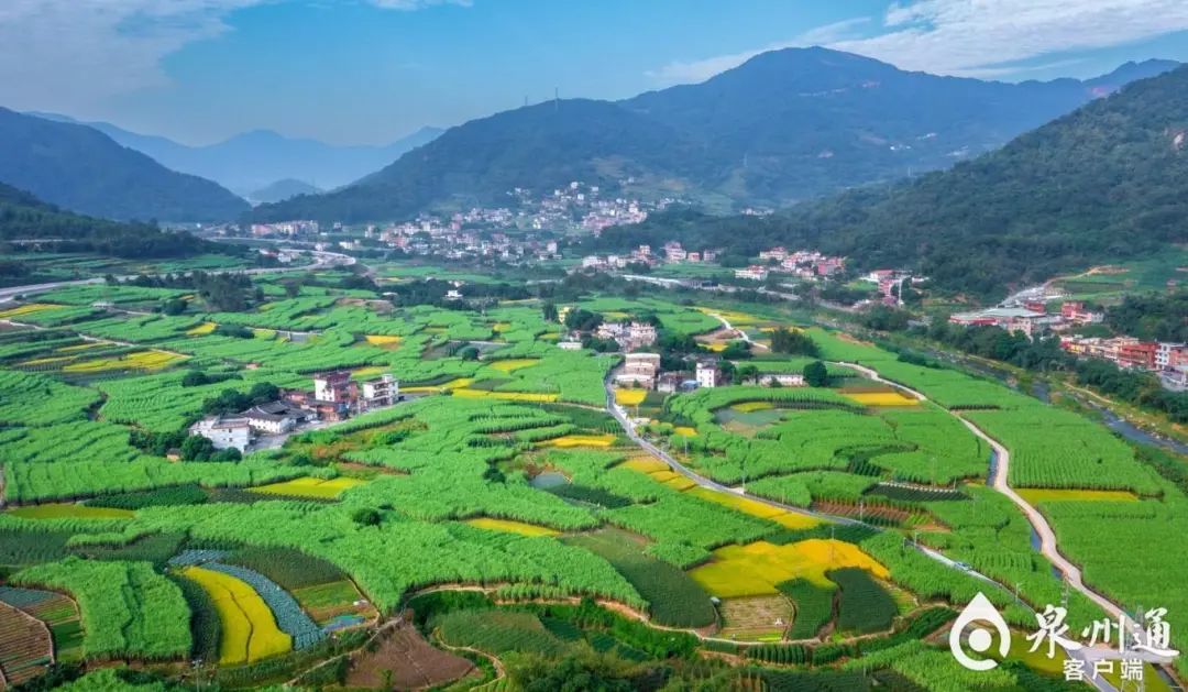 在永春县石鼓镇卿园村成片的田园里,交织在一起黄色的水稻田、绿色的甘蔗园、多彩的蔬菜地,与当地特色的古厝、民房交相辉映,呈现出一片丰收、祥和的乡村画卷。(泉州晚报社融媒体记者陈小阳 通讯员康庆平 摄)