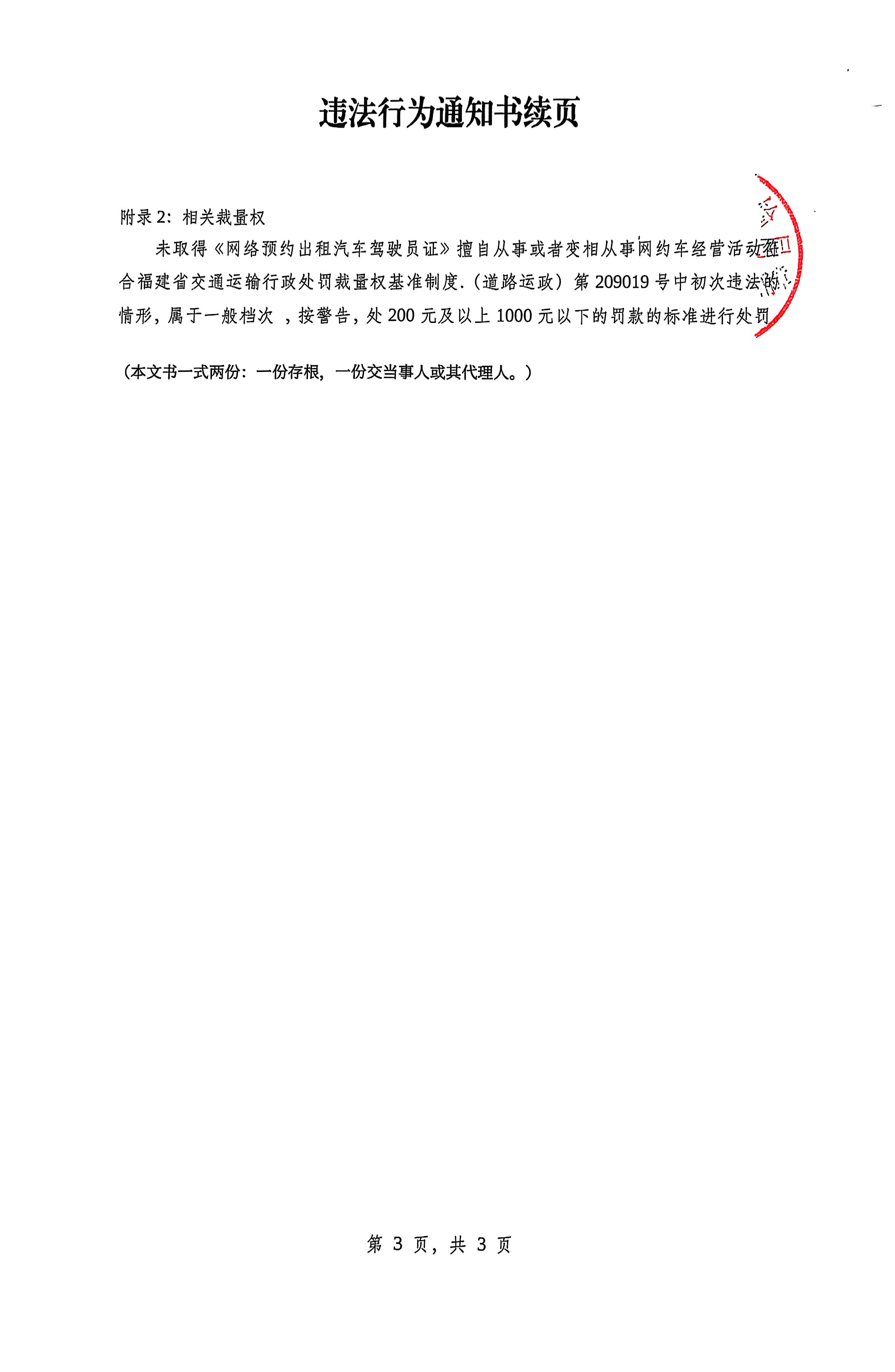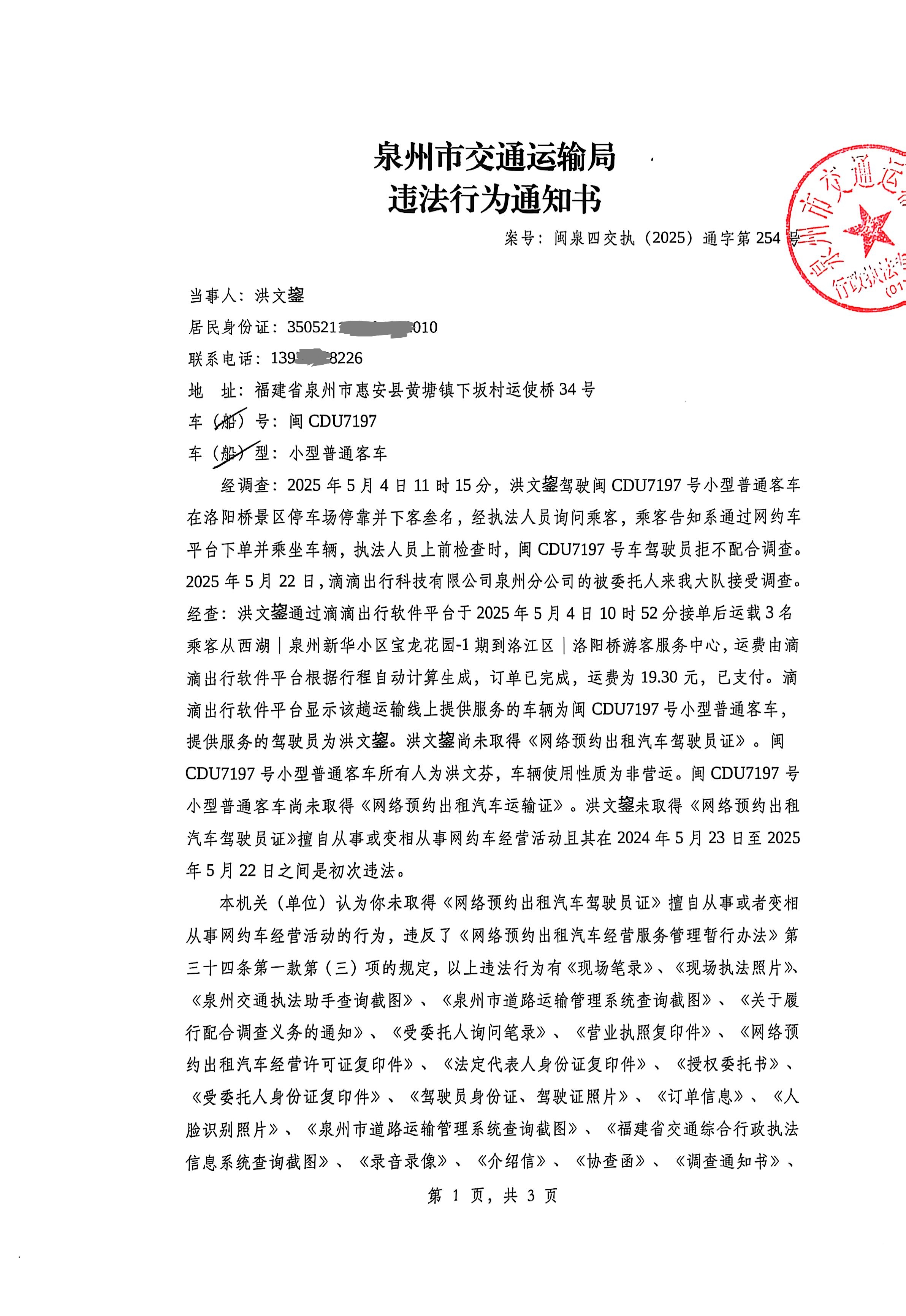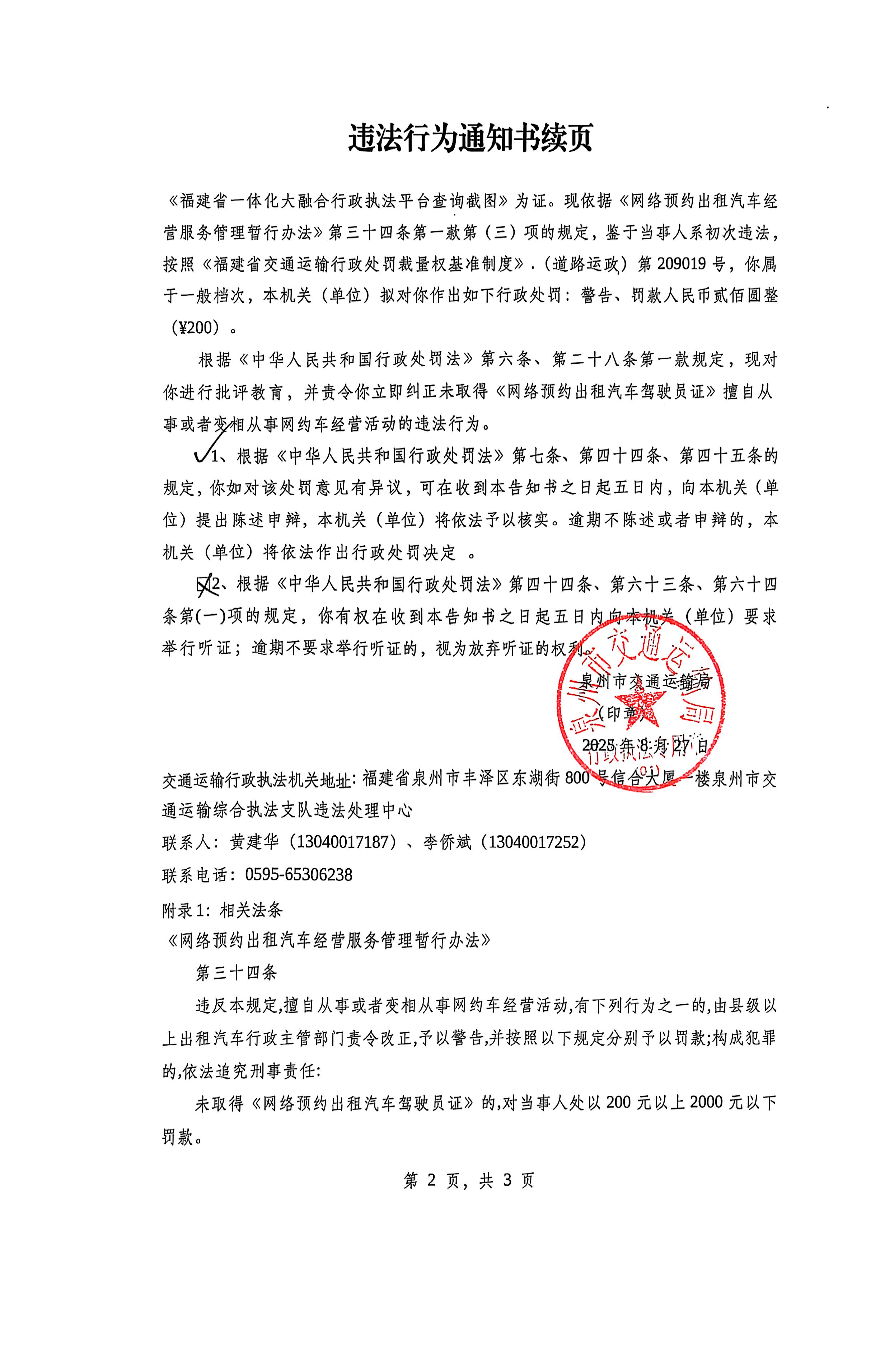 附件:《违法行为通知书》{闽泉四交执(2025)通字第254号}