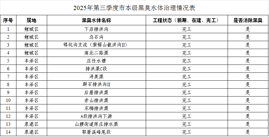 2025年第三季度市本级黑臭水体治理情况表(第三季度)