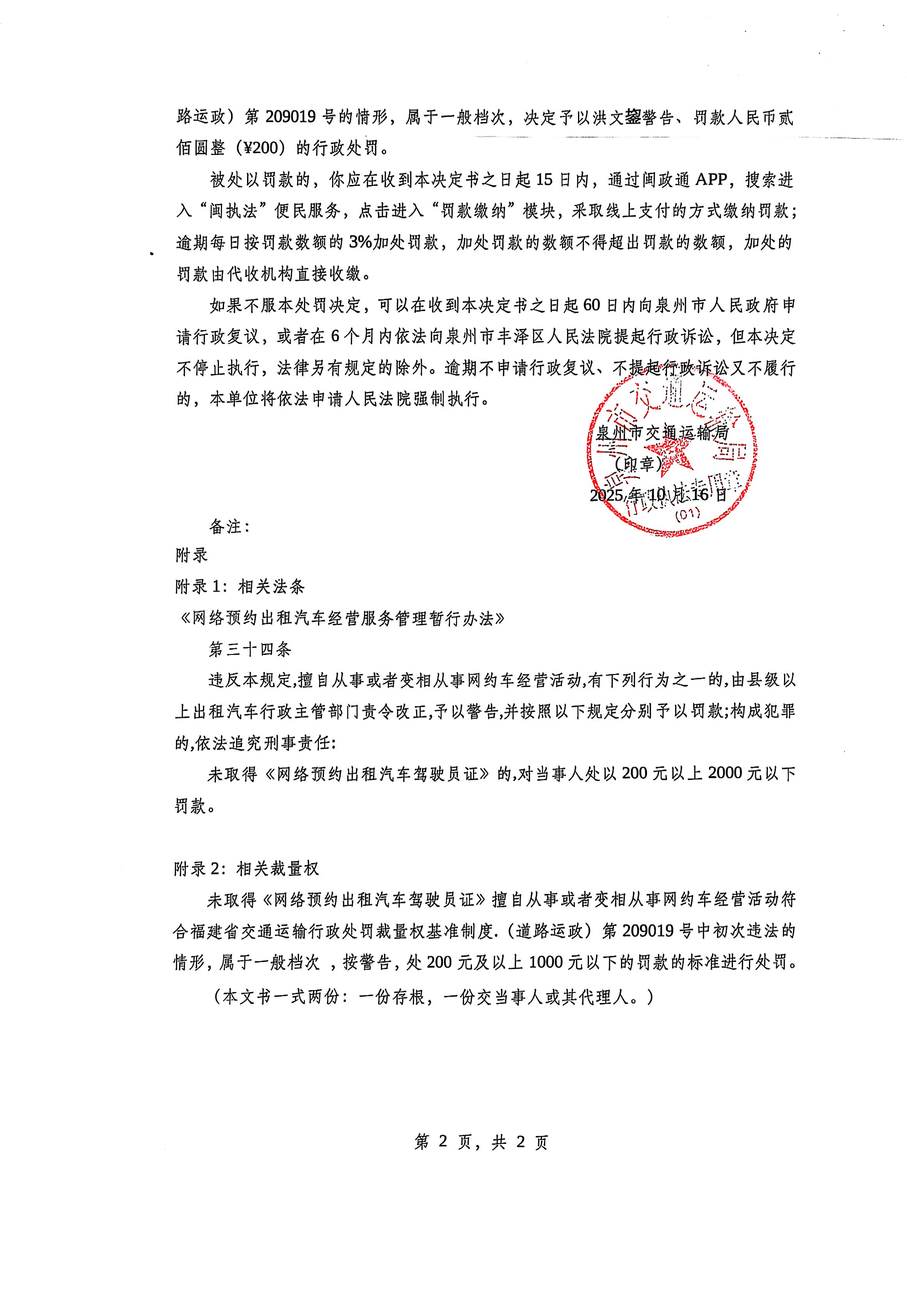 附件:《行政处罚决定书》(闽泉四交执(2025)罚字第254号)