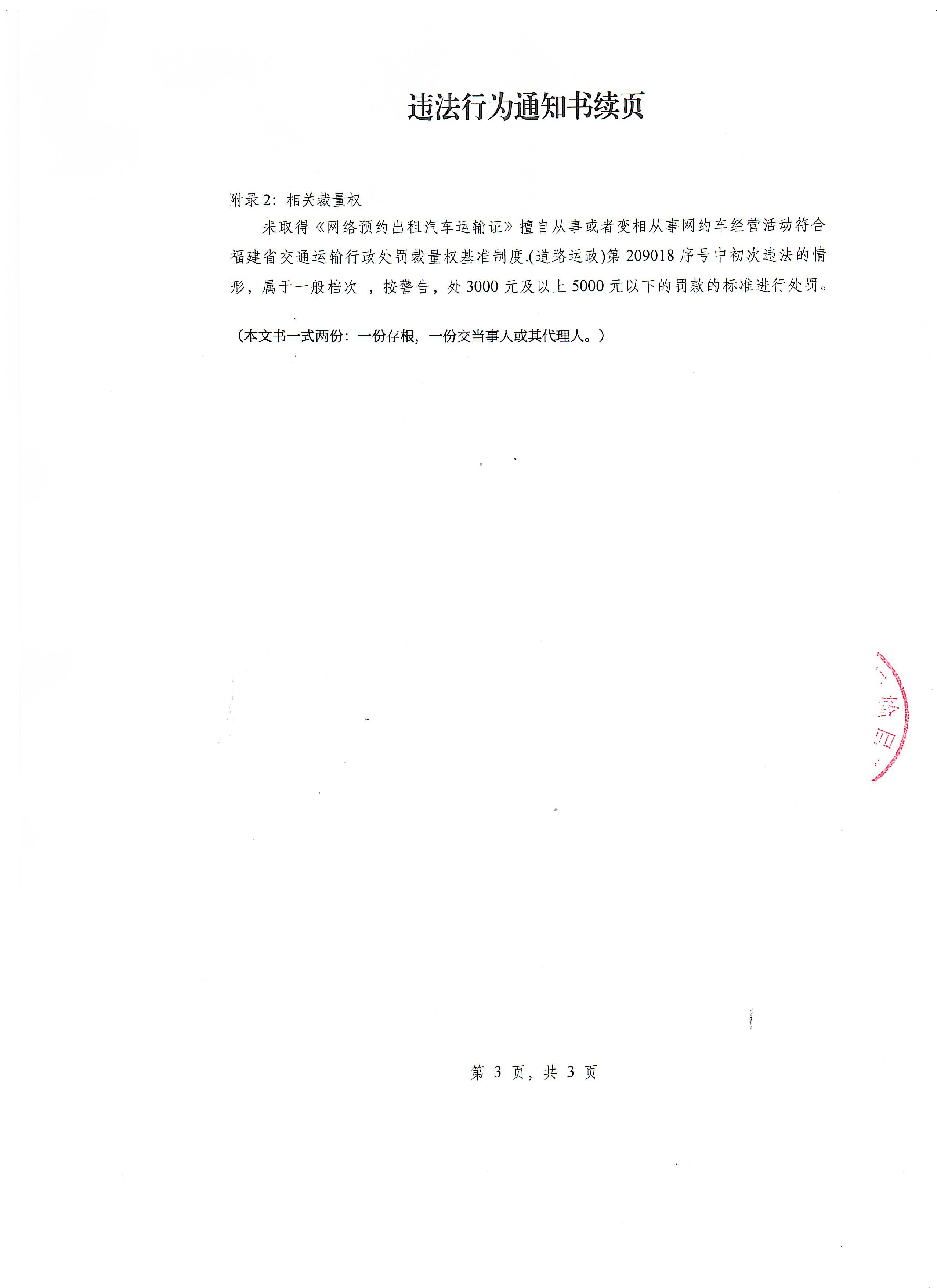 本机关于2025年10月16日对你未取得《网络预约出租汽车运输证》擅自从事或者变相从事网约车经营活动案拟作出警告,并处以罚款人民币叁仟元的行政处罚决定。同时,根据《中华人民共和国行政处罚法》第六条、第二十八条,对你进行批评教育,并责令你立即纠正上述违法行为。