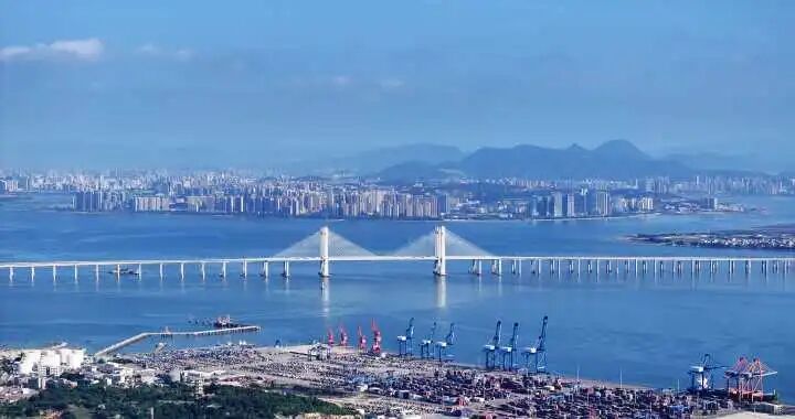 从石狮市向泉州中央商务区方向远远望去,繁忙的石湖港和泉州湾跨海大桥与城市风景相映成趣,景色如画,美不胜收。(张九强 摄)