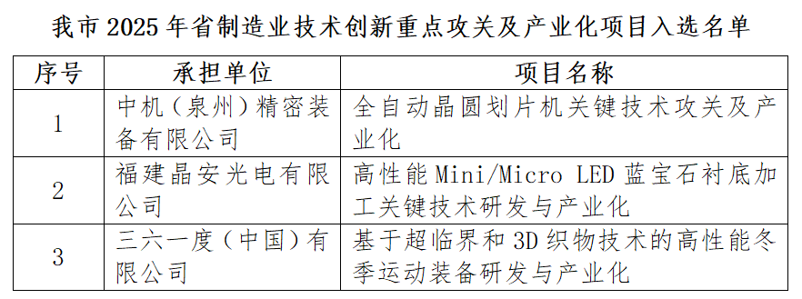 近日,2025年福建省制造业技术创新重点攻关及产业化项目名单公布,我市中机(泉州)精密装备有限公司、福建晶安光电有限公司、三六一度(中国)有限公司等3家企业申报的技术创新项目名列其中。