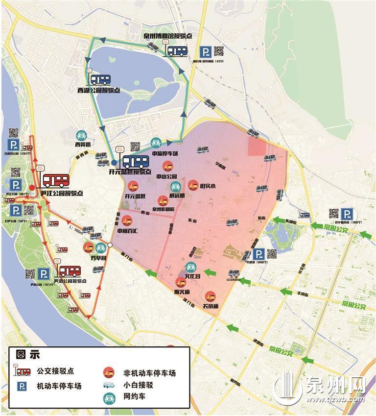 交警介绍,自驾车市民、游客请将车辆停放至外围停车场,然后选择公共交通工具接驳出行。外围停车场地点有:白水营公园停车场、笋江公园停车场、石笋公园停车场、北滨江公园笋浯园停车场、中国闽台缘博物馆停车场、泉州侨乡体育馆停车场、富临新天地停车场。
