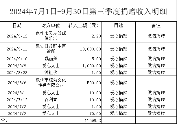 2024年7月1日-9月30日第三季度捐赠收入明细