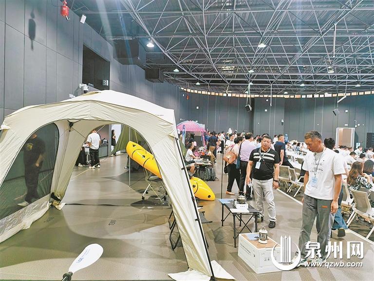 现场装备展区,帐篷、充气艇等露营好物陈列,吸引参观者驻足了解,为露营产业交流搭建平台。