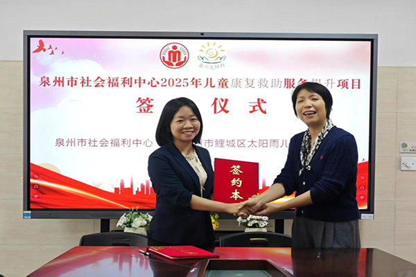 近日,泉州市社会福利中心与泉州市鲤城区太阳雨儿童培训学校举行儿童康复救助服务提升项目签约仪式。泉州市社会福利中心主任陈春燕及相关科室负责人,泉州市鲤城区太阳雨儿童培训学校校长林丽萍及项目执行人员共同参与活动。签约仪式上,双方围绕智力障碍儿童的康复需求、资源整合、服务标准化建设等议题展开深入交流,并正式签订合作协议。据悉,2025年1月,泉州市社会福利中心已通过全面评审,纳入泉州市智力残疾儿童康复定点协议管理机构。机构配备智力测评室、康复训练室等十余个功能区域及专业团队,为智力残疾儿童提供康复服务。通过此次合作,将构建起从筛查评估到持续跟踪的全链条服务体系,这也标志着泉州市社会福利中心智力残疾儿童康复定点协议机构迈入专业化、规范化新阶段,为智力障碍儿童实现功能改善、融入社会提供坚实保障。