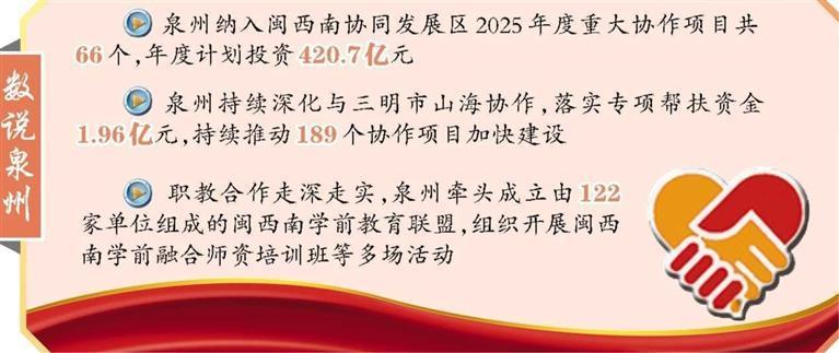 推动协同发展共享平台建设,推进公共服务共建共享。去年以来,泉州在原有11个平台的基础上,配合新增建立五市对台融合平台,推动空间信息共享技术服务平台、旅游宣传推广“五个一”综合平台、股权交易中心闽西南科技板等8个平台投入运行。此外,泉州持续深化与三明市山海协作,落实专项帮扶资金1.96亿元,持续推动189个协作项目加快建设。去年以来,在南安与厦门翔安打造毗邻区协同发展先行示范区的基础上,永春县、德化县与三明市大田县签订毗邻区融合发展协议,推动三地建立融合发展工作机制,在基础设施、产业发展、公共服务等方面实现有机融合。以构建公共服务信息共享平台为基础,在区域协同发展上,泉州逐步推进教育、医疗、人才、文旅、联合执法等方面协作共享,共建社会事业发达、公共服务均等的优质生活圈。