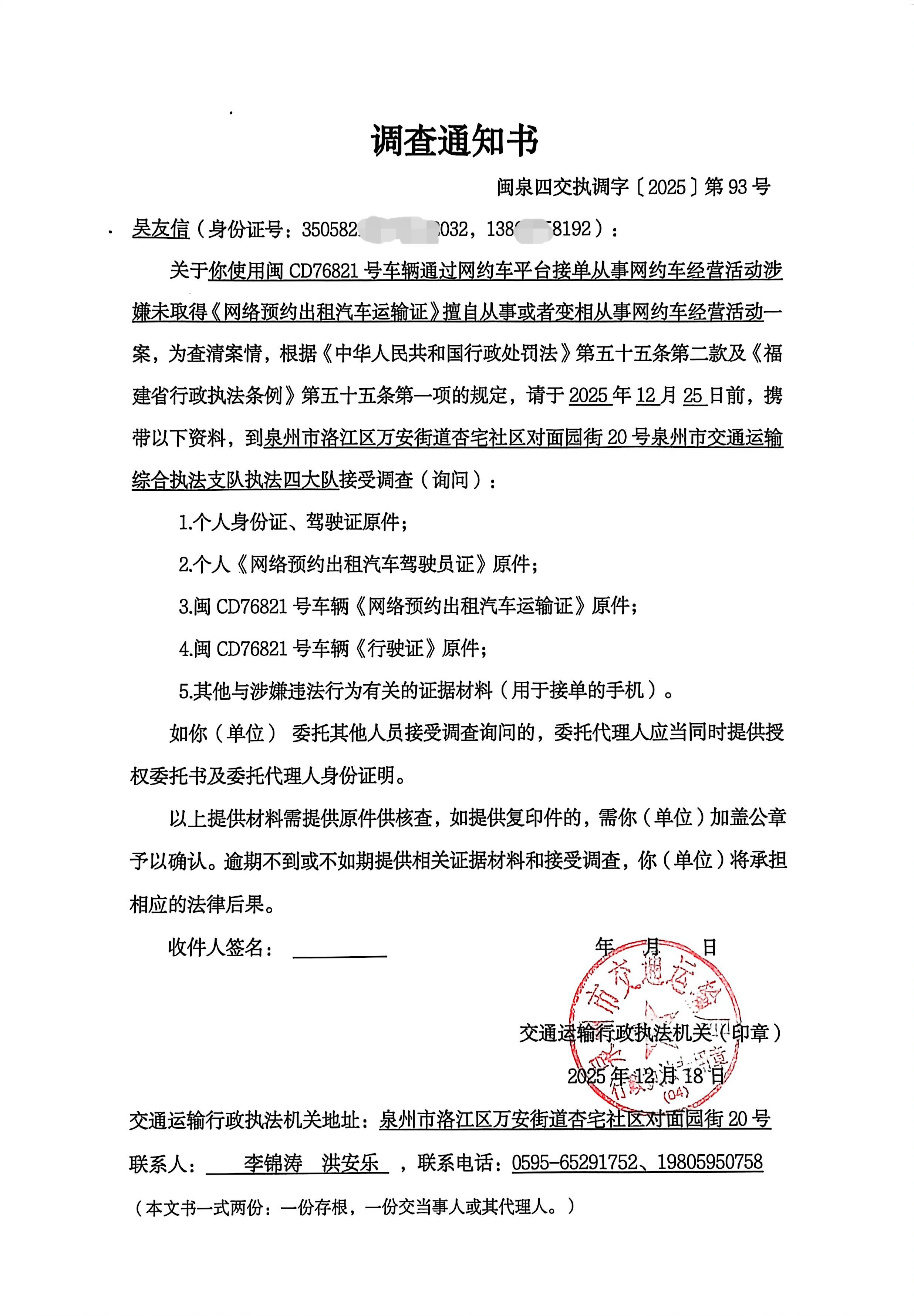关于你使用闽CD76821号车通过滴滴平台接单从事网约车经营活动涉嫌未取得《网络预约出租汽车运输证》擅自从事或者变相从事网约车经营活动一案,为查清案情,根据《中华人民共和国行政处罚法》第五十五条第二款及《福建省行政执法条例》第五十五条第一项的规定,请于收到本通知书之日起五个自然日内,携带以下资料,到泉州市洛江区万安街道杏宅社区对面园街20号泉州市交通运输综合执法支队执法四大队接受调查(询问):