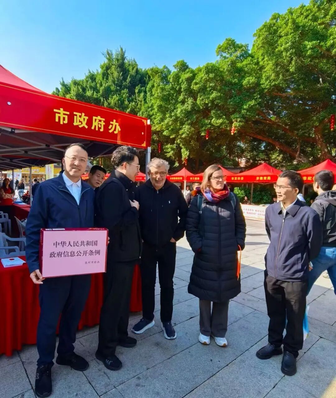 当天,泉州市政府办结合2025年泉州市“宪法宣传周”主场活动,开展机关党委普法教育主题党日活动,安排政务公开科、领事文化科、住房公积金管理中心等相关工作人员在鲤城区府文庙广场现场宣传《中华人民共和国政府信息公开条例》《中华人民共和国领事保护与协助条例》和《住房公积金管理条例》等政策法规,同时在现场推介《泉州市人民政府公报》、“泉州政务”微信公众号及视频号,现场群众踊跃参与,反响热烈。其中,国际友人美国马里兰大学教授JOSE FEIJO夫妇也到现场了解相关政策法规。当日发放宣传材料两百余份,有效提高了群众的法治意识,推动宪法深入人心,用法治守护“世遗之城”,建设法治泉州。