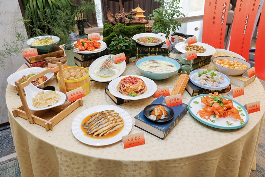 “郑和家宴”以书卷衬盘,菜名雅致,用材讲究,尽显中式宴饮的文化韵致。