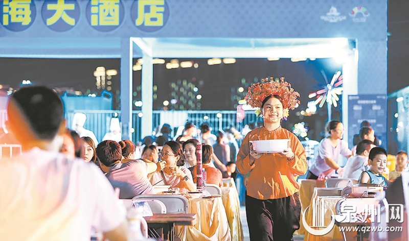 Waitstaff in traditional Xunpu attire serve guests during the Xunpu Fresh Crab and Beer Festival at Fengze Fishermen's Wharf. (Photo by Lin Jinfeng)