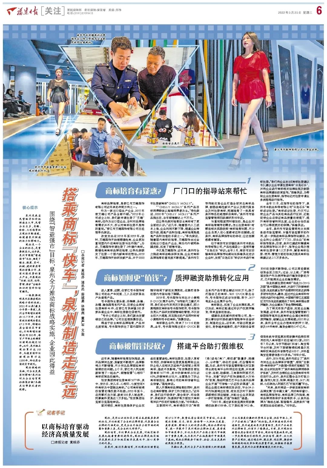 深入开展商标品牌培育的同时,泉州也在商标管理、保护工作方面发力。“近年来,我们在行政保护、联合保护、司法保护、异地保护、快速保护等方面加大商标等知识产权的打假维权力度。”刘华表示。