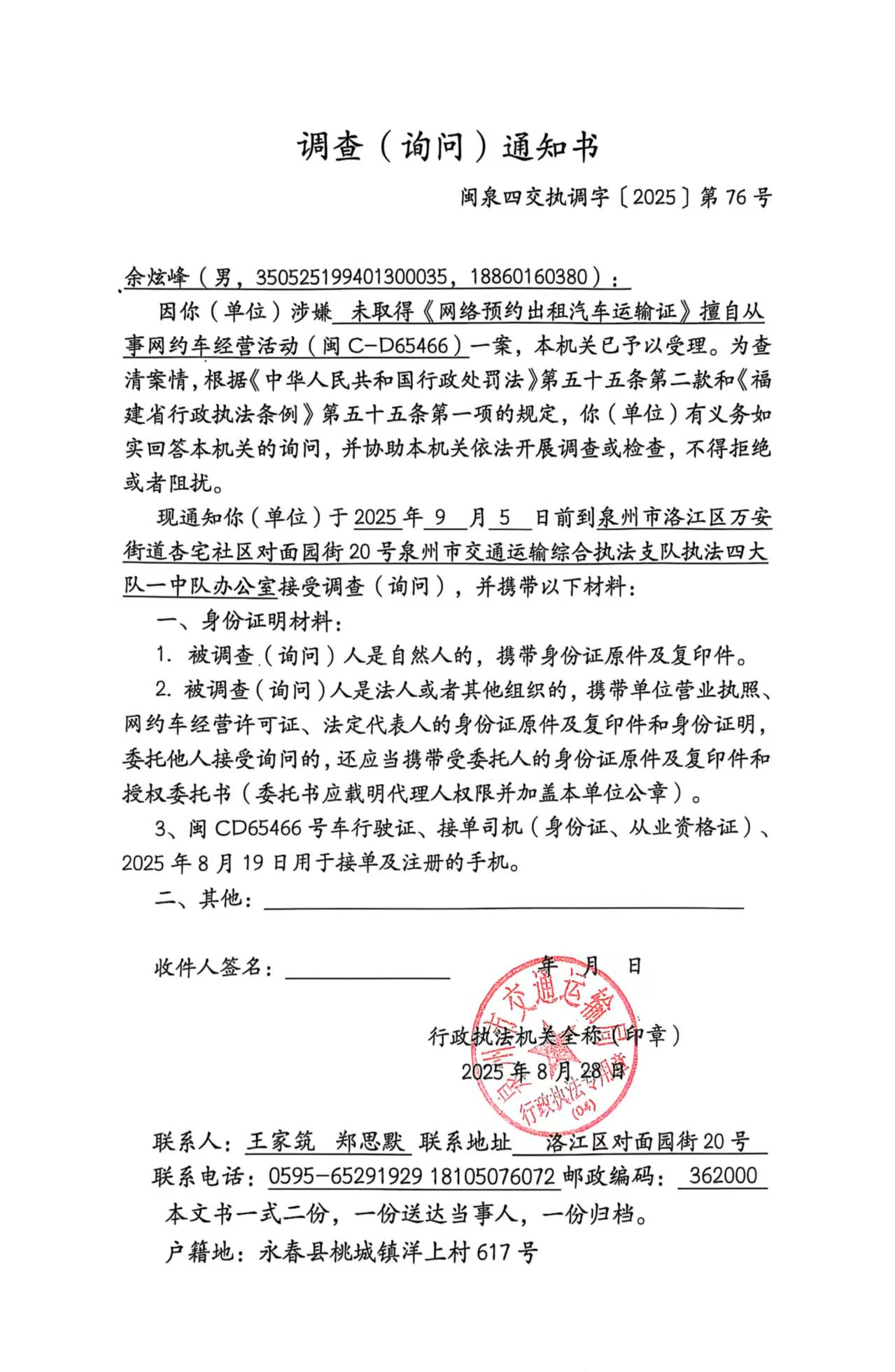 关于你使用闽CD65466号车通过滴滴平台接单从事网约车经营活动涉嫌未取得《网络预约出租汽车运输证》擅自从事或者变相从事网约车经营活动一案,为查清案情,根据《中华人民共和国行政处罚法》第五十五条第二款及《福建省行政执法条例》第五十五条第一项的规定,请于收到本通知书之日起五个自然日内,携带以下资料,到泉州市洛江区万安街道杏宅社区对面园街20号泉州市交通运输综合执法支队执法四大队接受调查(询问):