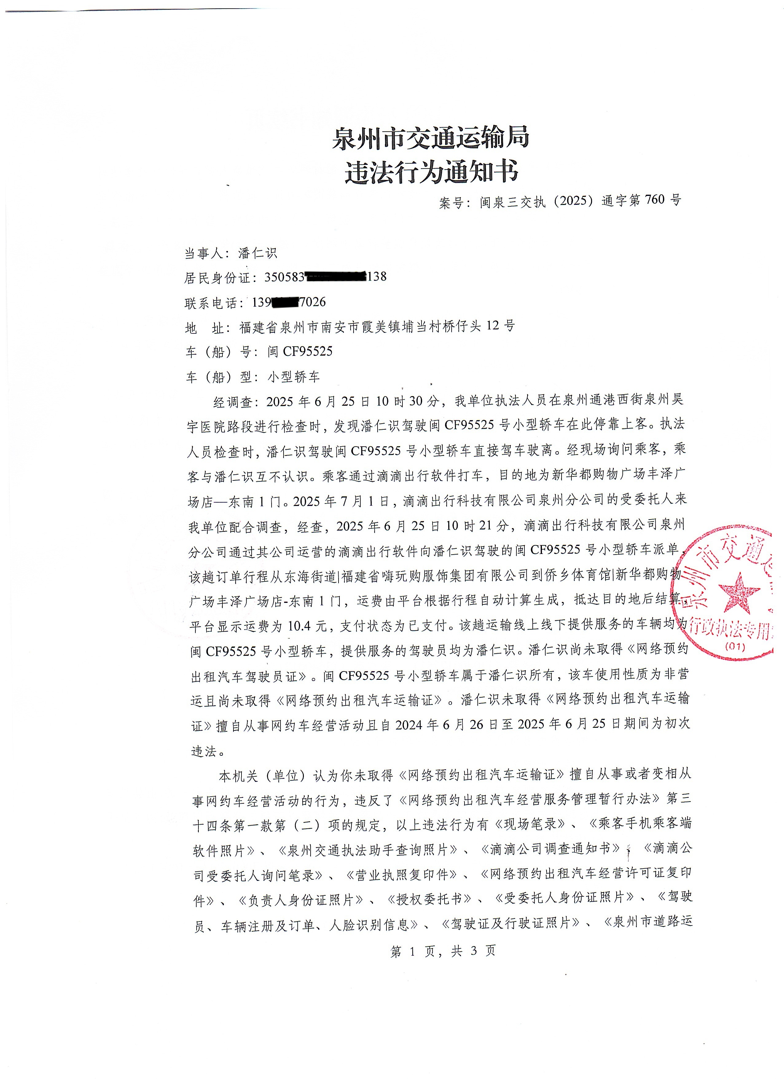 附件:《违法行为通知书》(闽泉三交执(2025)通字第760号)