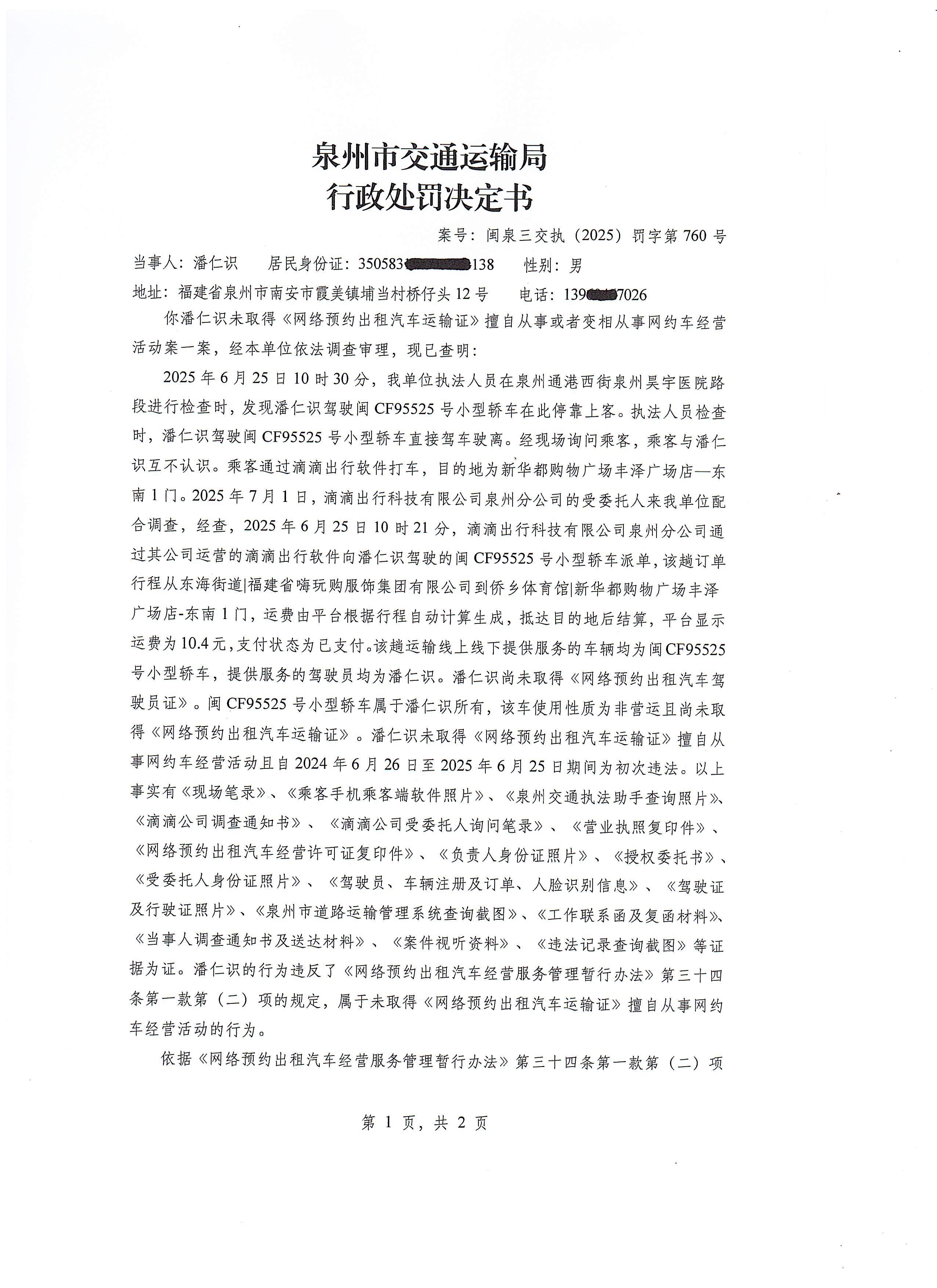 附件:《行政处罚决定书》(闽泉三交执(2025)罚字第760号)