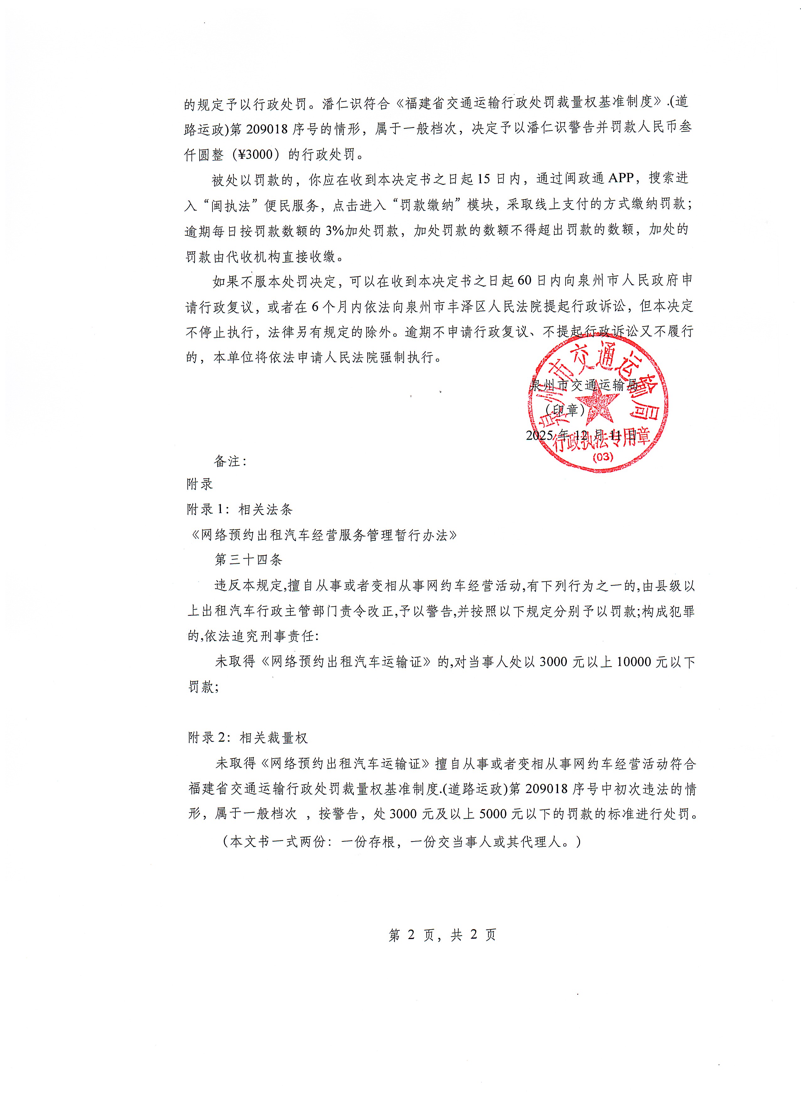 因你无法通过其它方式送达法律文书,现依法向你(单位)公告送达。请你自本公告发布之日起30日内前往泉州市丰泽区东湖街800号信合大厦一楼违法行为处理中心领取《行政处罚决定书》(闽泉三交执(2025)罚字第760号),逾期则视为送达。