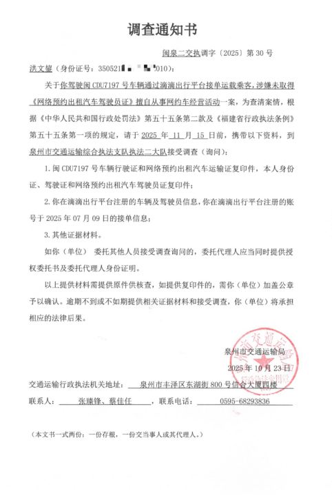 关于你于2025年07月09日09时44分驾驶闽CDU7197号小型轿车通过滴滴网约车平台涉嫌未取得《网络预约出租汽车驾驶员证》擅自从事网约车经营活动一案,为查清案情,根据《中华人民共和国行政处罚法》第五十五条第二款及《福建省行政执法条例》第五十五条第一项的规定,请于收到本通知书之日起五个自然日内,携带以下资料,到泉州市丰泽区东湖街800号信合大厦四楼泉州市交通运输综合执法支队执法二大队接受调查(询问):