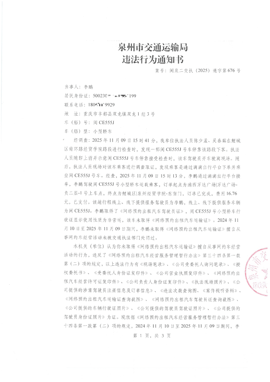 附件:《泉州市交通运输局违法行为通知书》[案号:闽泉二交执(2025)通字第676号]
