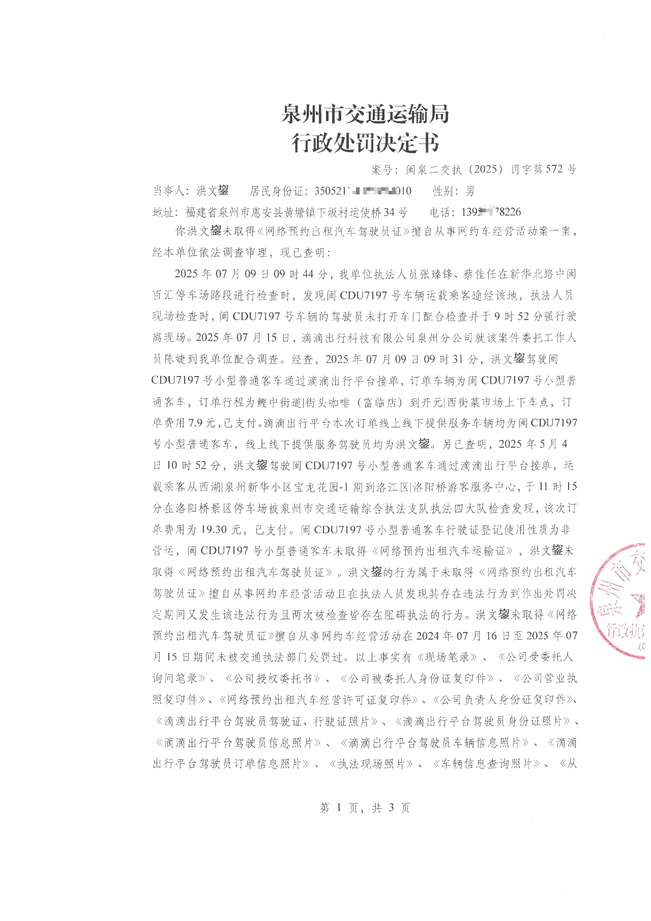 附件:《泉州市交通运输局行政处罚决定书》[案号:闽泉二交执(2025)罚字第572号]
