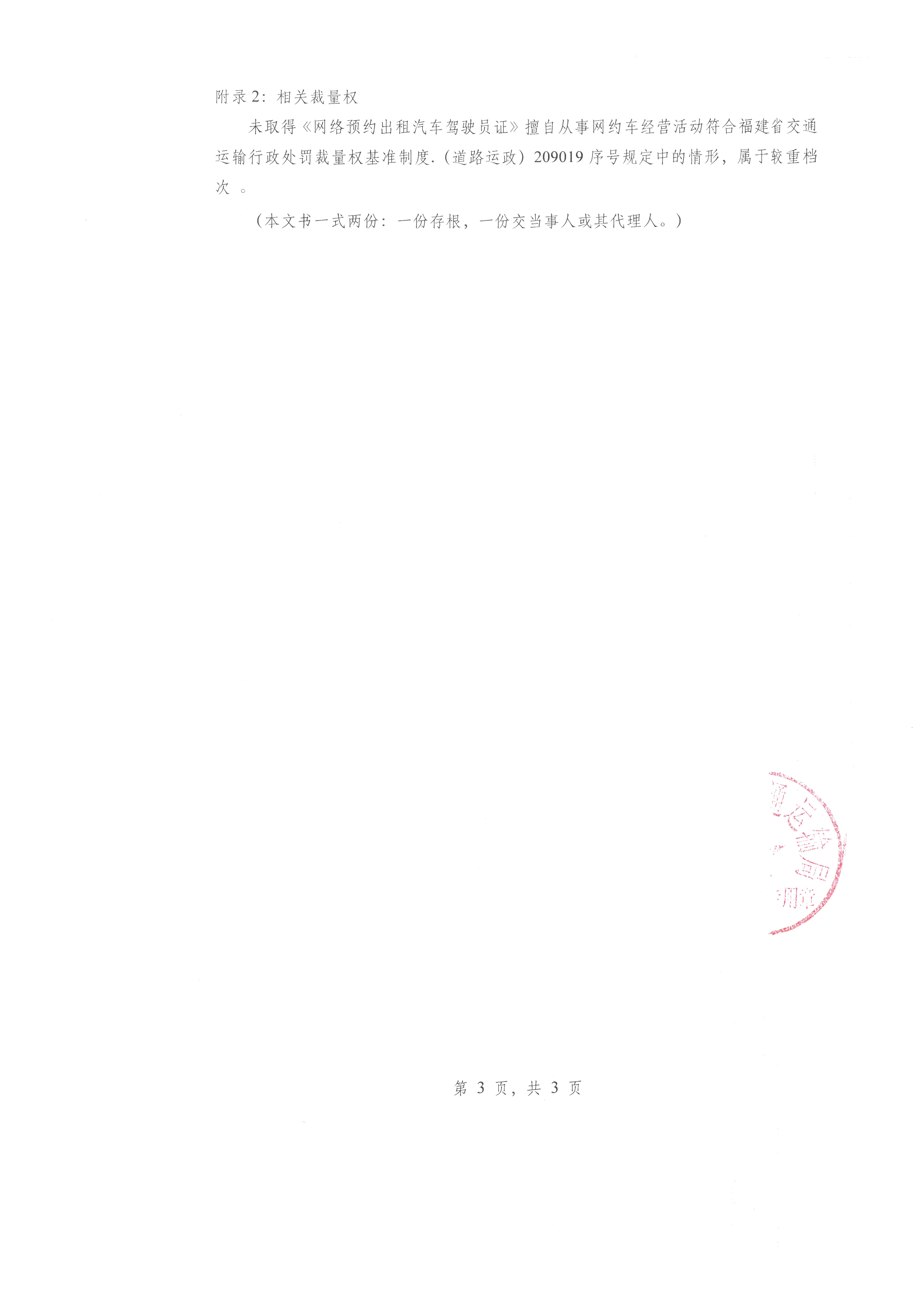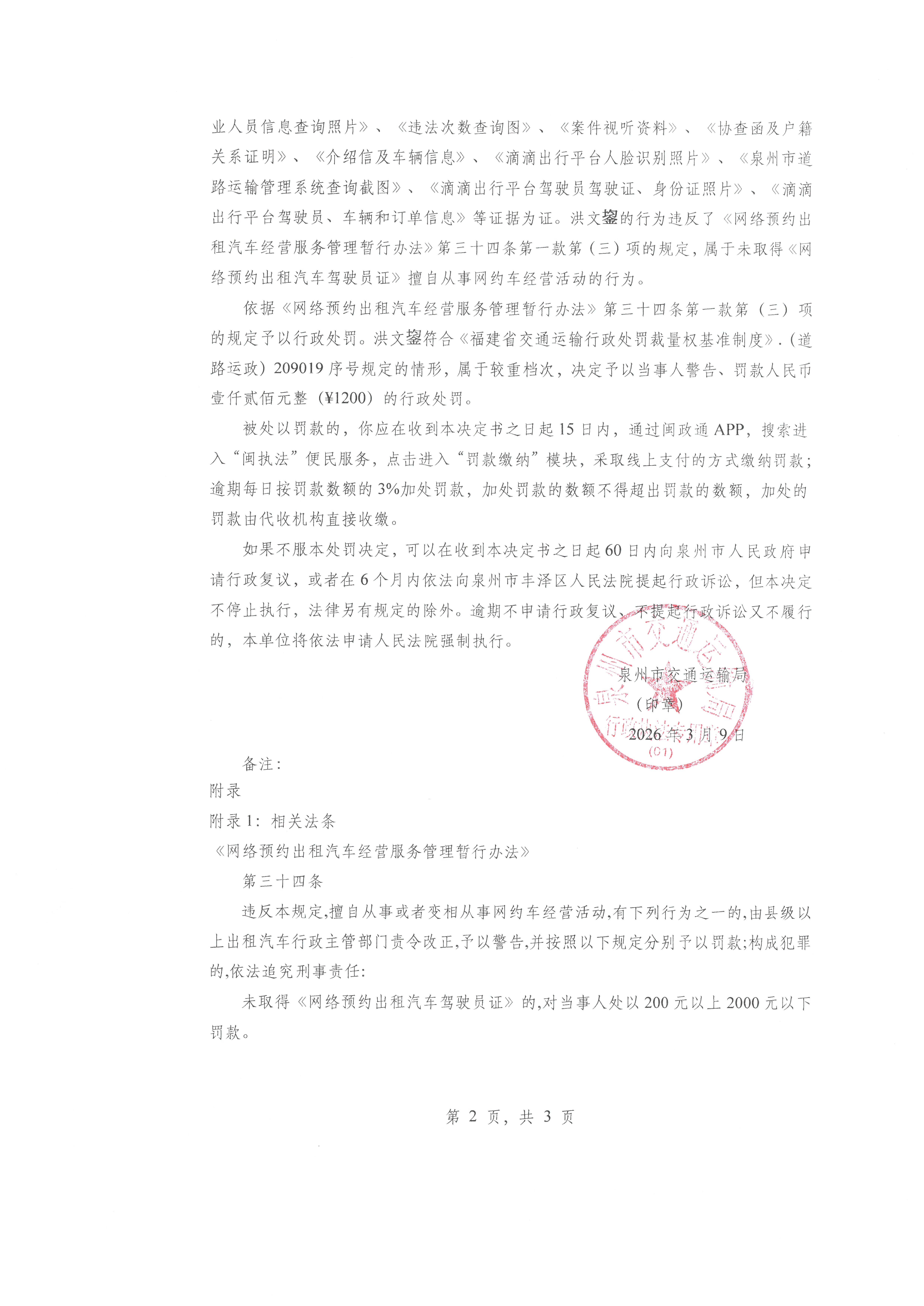 本机关于2026年03月09日对你未取得《网络预约出租汽车驾驶员证》擅自从事网约车经营活动一案作出警告、罚款人民币壹仟贰佰圆整的行政处罚决定。
