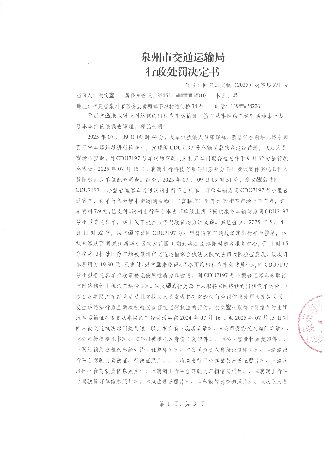 附件:《泉州市交通运输局行政处罚决定书》[案号:闽泉二交执(2025)罚字第571号]