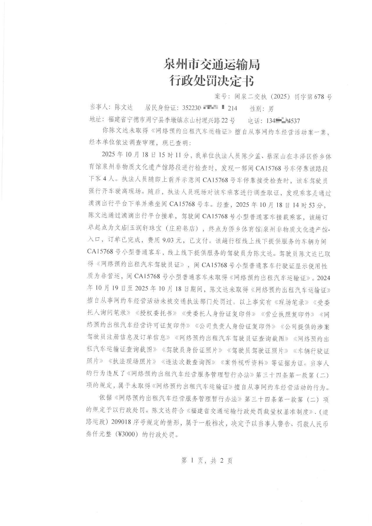 附件:《泉州市交通运输局行政处罚决定书》[案号:闽泉二交执(2025)罚字第678号]