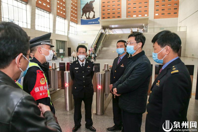 泉州动车站人员流动性大,防控任务十分艰巨。康涛实地查看了疫情检测防控、春运旅客转运、站前交通秩序等情况,详细了解如有疑似感染者从接收、检查、运送、分诊、救治的整个工作流程,共同分析研判了意外情况的应急处置方法。他表示,要加大对重点部位、重点场所的监管和卫生消杀处置力度,在重要出入口把严把实进出人员的体温检测关,增加检测人员和检测仪器,对体温异常人员要严格按照规范处置。对交通场站设施等密闭交通工具,都要采取通风、消毒,进一步加强源头防控。