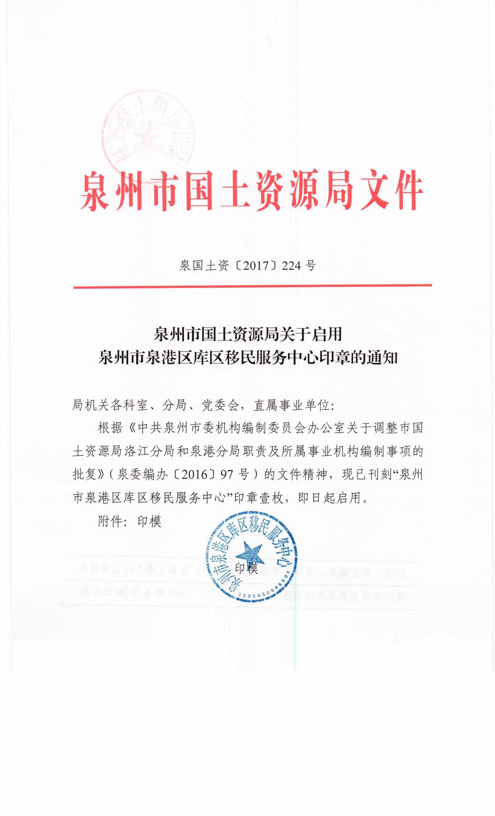 泉州市国土资源局关于启用泉州市泉港区库区移民服务中心印章的通知