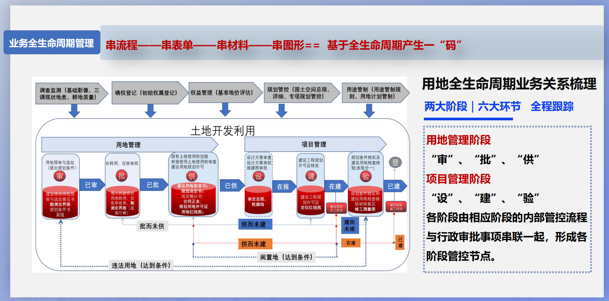 以建设用地状态演变为核心,从前期调查监测、确权登记、权益管理、规划管控、用途管制、开发利用、监督监管到生态保护修复,梳理出“两大阶段、六大环节”主链条,基于“唯一项目号”串联土地全生命周期信息,完成全局49项业务事项在线流转和统一平台联网审批,实现全业务覆盖、全流程贯通。