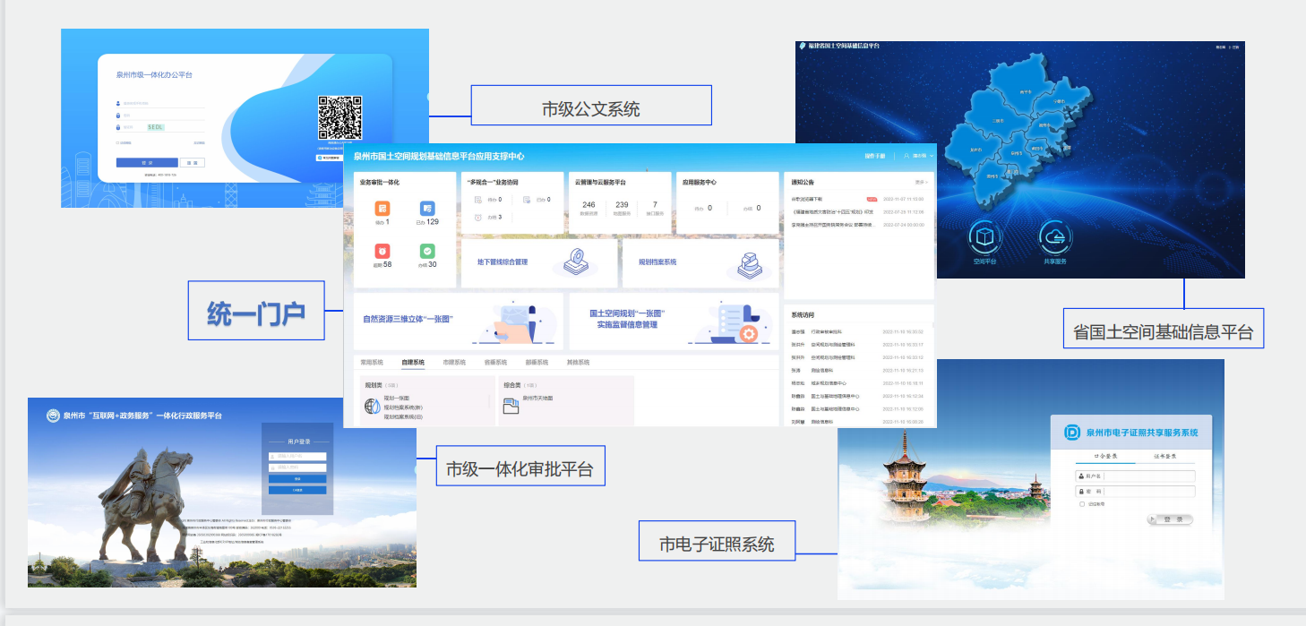 打通多平台用户数据,建立统一登录门户,推进整合信息共享,破除系统之间壁垒,实现系统的高效交互,建成具备自动获取关联数据、标准化业务审查、图层智能审核、证照在线调阅、信息实时共享等特点的应用。