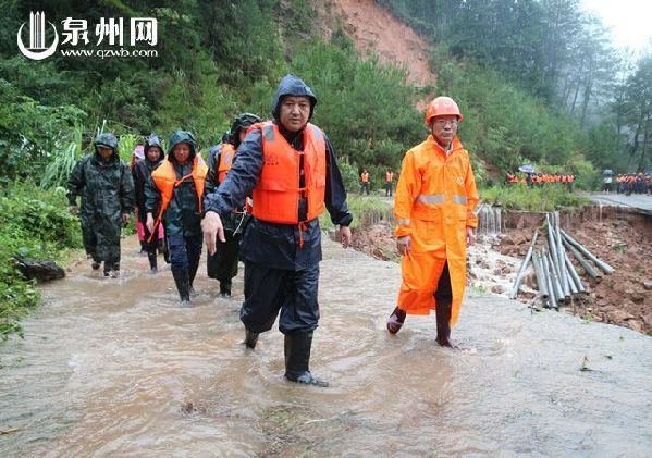 今日一大早,市委书记郑新聪赶赴受灾严重的德化县水口镇,昨晚到早上八点内300多毫米的降水导致山洪爆发,前往梨坑村道路有一段被大面积被掏空,车辆无法通行。郑书记涉水步行出入现场,对救灾工作提出具体要求,然后马不停蹄赶往下一个受灾点。