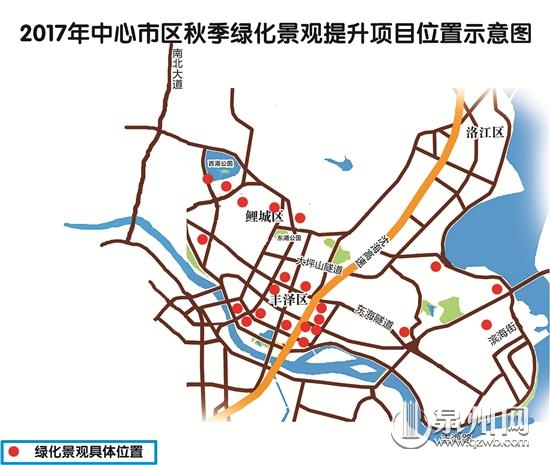 市园林局相关负责人表示,这些是2017年中心市区秋季绿化景观提升项目,共有22个。具体为:西湖公园西南侧街边花园、东海立交箱植同安红三角梅、后渚立交箱植同安红三角梅、丰海路云鹿路至经三路口拆墙透绿、田安南路(高架桥边)空地绿化、泉秀街与田安路交叉口大淮渠边拆墙建绿、市疾控中心东侧空地绿化、少林路沿线综合整治提升、东海延年公寓至双垵街拆墙增绿、北山隧道口边坡及两侧空地花化彩化、都督巷古榕公园、泉州七中沟边古榕公园、刺桐公园梳绿透绿、芳草园入口绿化广场改造、泉秀街沈海高速东侧拆违建绿、宝洲花园外西侧(临坪山高架)拆墙增绿、金帝花园外东侧拆墙建绿、新华北路(七星街口)口袋公园、市科技局原址口袋公园、仁风社区外东环城河口袋公园、宝洲街东南医院西侧街旁口袋公园、宝洲街肉联厂临街拆违增绿。
