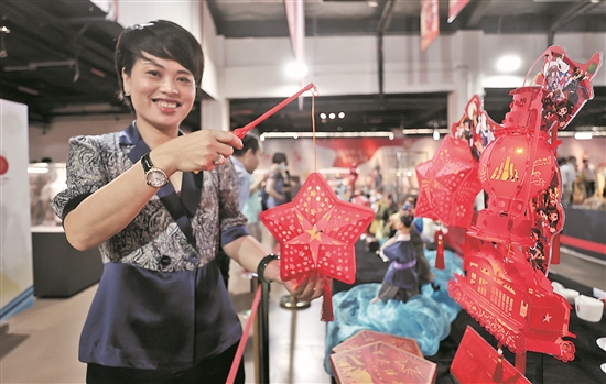 同时在现场展示展演的,还有泉州花灯市级传承人傅草艺。“你看这盏花灯加入党徽,体现的是党的领导,外面是牡丹花纹和祥云如意等,寓意人们的生活幸福、吉祥、如意。”傅草艺说,非遗并非束之高阁的存在,而是要融入时代特色,在创作题材上与时俱进,吸引年轻人的关注。