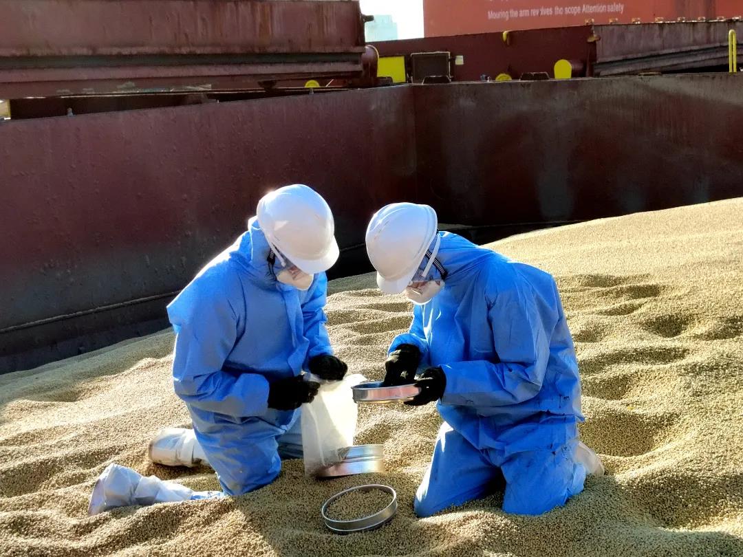 泉州海关泉港办关员对进口大豆开展表层检疫和取样工作(陈庆丰 摄)