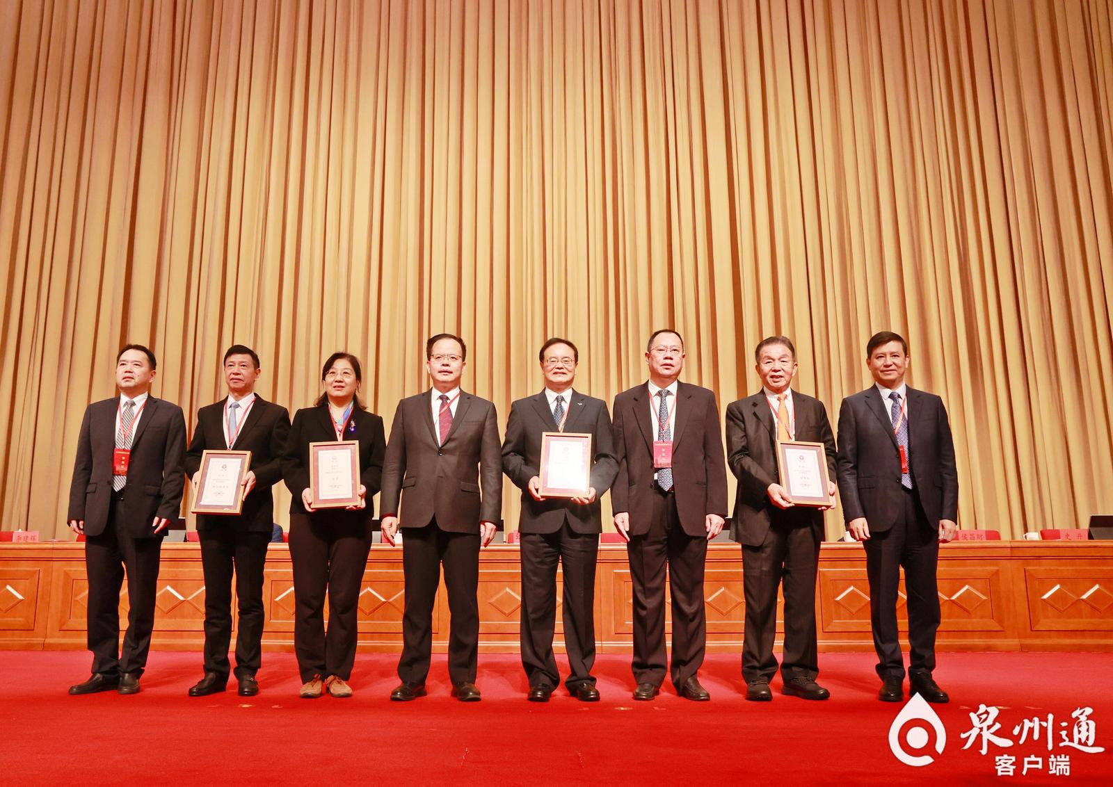 市委书记张毅恭、市长蔡战胜、市人大常委会主任李建辉、市政协主席肖汉辉为泉州民营经济研究院名誉院长庄聪生、院长史丹、理事长许连捷、执行理事长刘文儒颁发证书并合影留念。(陈英杰摄)