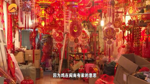 今年是生完第二年,娘家送给孩子的公鸡灯,希望他们可以多子多孙。第一年送纸糊的莲花灯,一共有两朵,一朵白花,一朵红花,夫妻俩在房间里面点灯,看哪一朵先烧起来,如果白花先着起来就会生儿子,红花生女儿。公鸡灯就放着,因为鸡在闽南有家的意思,象征起家,可以一家团圆、新年发财,所以我们很喜欢公鸡。