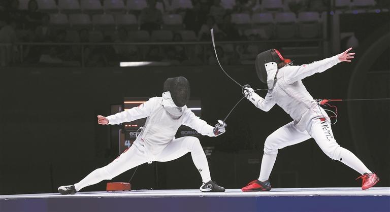 女子个人花剑决赛中,中国选手黄芊芊(左)战胜日本选手上野优佳,夺得冠军。(新华)