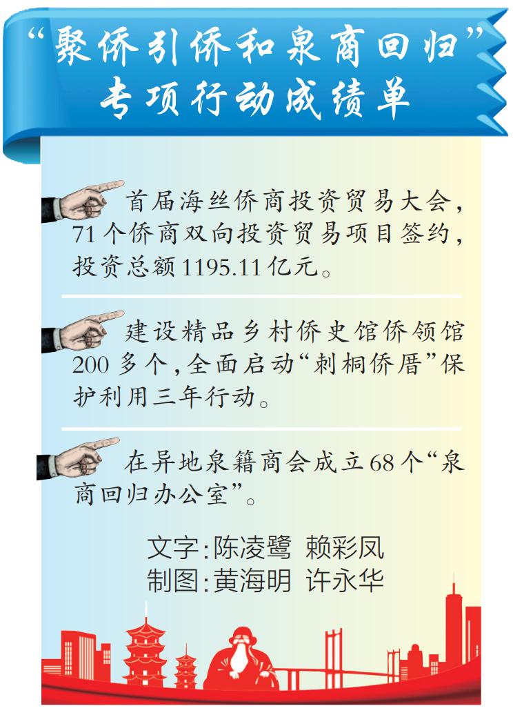 优化服务打造回归首选家园,搭建海丝传播中心渠道,讲好海内外泉州人的泉州故事,推进《泉州市华侨历史遗存保护条例》立法工作,以文聚侨、留根铸魂。设立“泉州企业家日”,建设泉州民营经济研究院,持续传承弘扬“晋江经验”,营造尊商、重商、亲商、护商社会氛围。在异地泉籍商会挂牌成立68个“泉商回归办公室”,引导项目、投资、人才回归。创新建立“同心会客厅”,加快建设“故土家园·海内外泉侨泉商联络总部”,为返乡侨亲联络联谊、交流合作提供温馨平台。