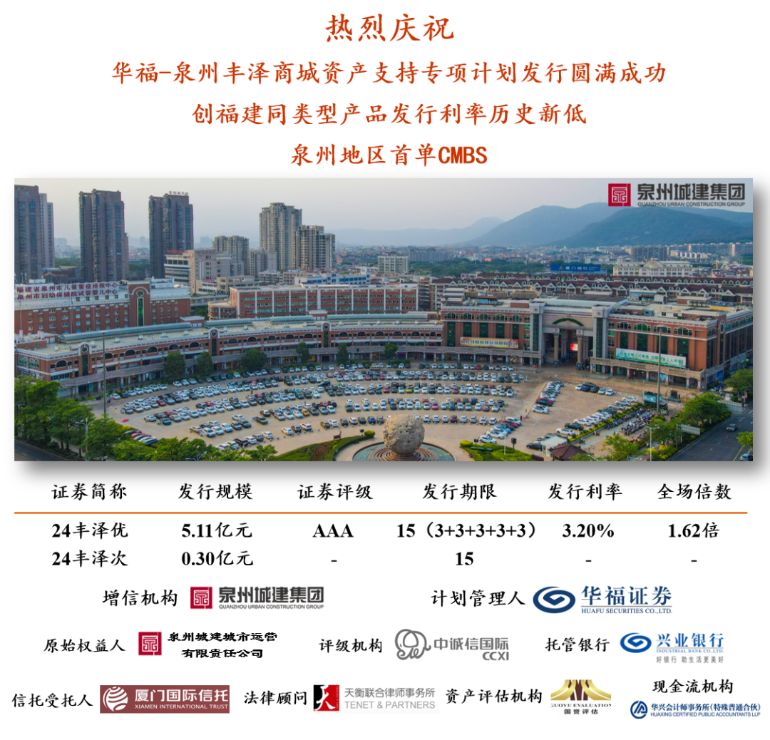 日前,丰泽商城资产支持专项计划(CMBS)成功发行,规模5.41亿元,认购倍数达1.62倍,最长期限15年,利率3.2%,创福建同类型产品新低。本次丰泽商城CMBS的发行,实现了泉州地区商业资产证券化产品“零”的突破。