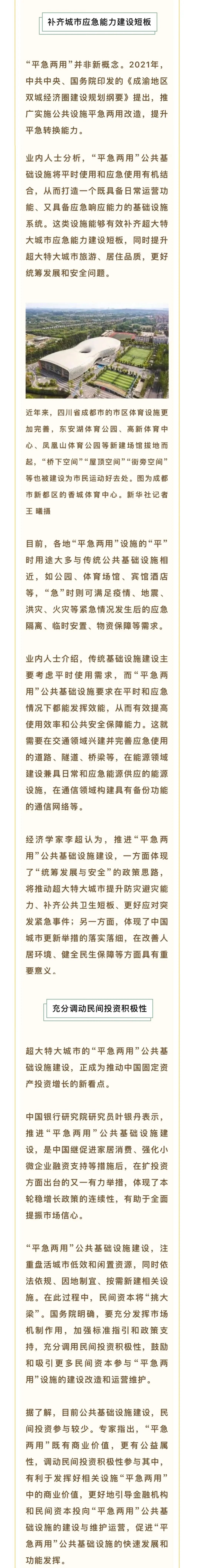 去年来,市发改委会同市住建局、卫健委对照国家关于稳步推进超大特大城市“平急两用”公共基础设施建设的要求,立足当前基础设施布局情况,统筹发展和安全,编制我市“平急两用”公共基础设施建设工作方案,进一步完善医疗卫生服务体系,补齐隔离房源、应急物资转运设施等短板,降低新发重大疫情和突发公共事件对中心城区的潜在影响。目前全市已有60个项目正式纳入国家“平急两用”公共基础设施管理系统,总投资301.17亿元。