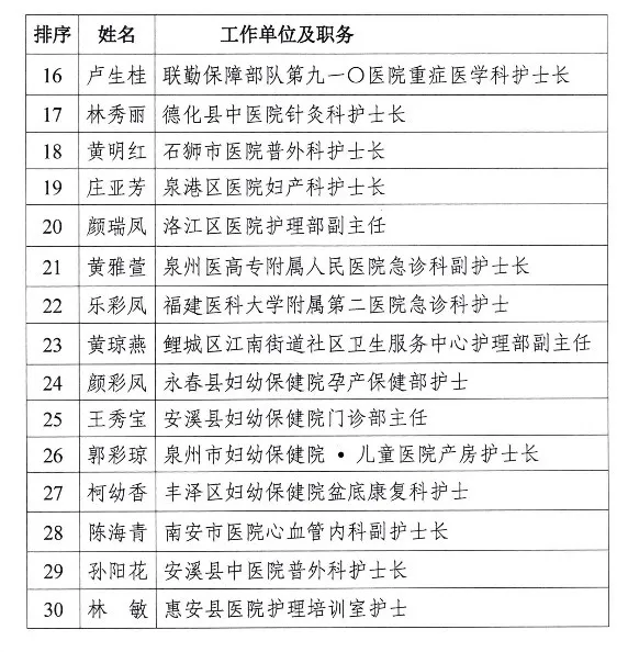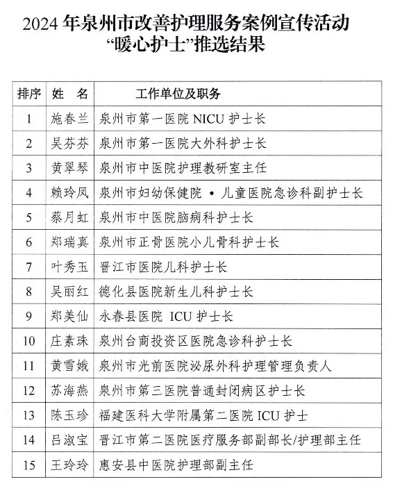 为传承和弘扬南丁格尔无私奉献精神,贯彻落实《福建省落实进一步改善护理服务行动计划工作方案(2023—2025年)》,以“强基础、提质量、促发展”为主题,持续深化“以病人为中心”的理念,满足群众多样化的护理服务需求,在第113个国际护士节来临之际,泉州市委宣传部、泉州市卫生健康委员会在全市范围内征集推选“暖心护士”,全方位展现我市卫生健康系统护理工作者的精神面貌和职业风采,通过网络投票和专家评审,30名护理工作者获“泉州市改善护理服务‘暖心护士’”殊荣。